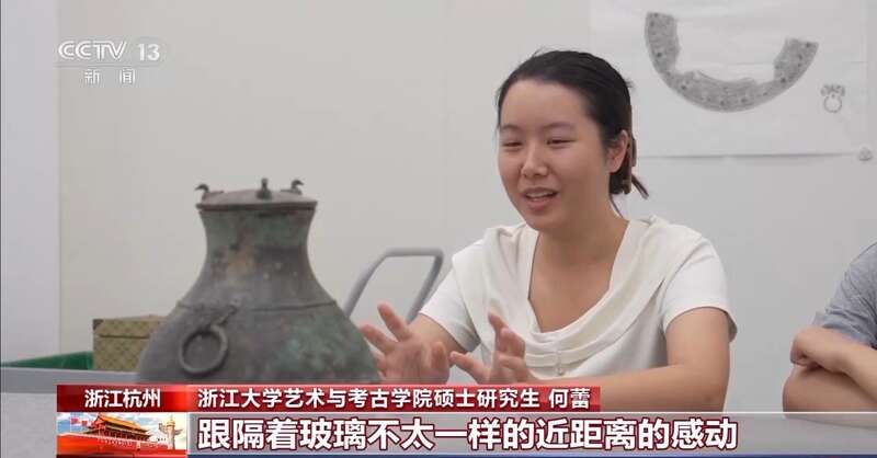 浙江大学艺术与考古学院硕士研究生 何蕾:跟隔着玻璃不太一样的近距离的感动,我像是握住了一根细绳,而绳的那一边是我们几千年前祖先的脉搏和心跳。当时进入这个专业的初心,也是为了让更多的人像我一样热泪盈眶地去看文物,希望我以后能将这种感动带给更多的人。