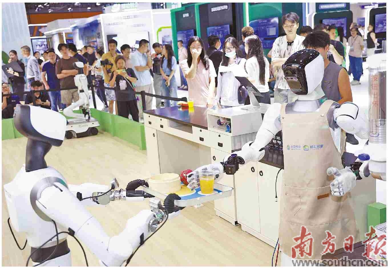 展区无人餐厅内,多台机器人正自主协作,为观众奉上地道的广州早茶;户外远程机器人跑酷秀更是让观众惊叹连连,四足机器狗“灵犀”不仅能陪聊陪玩,还能在露营、跑步等场景中贴心陪伴,成为智慧家庭中的重要一员。